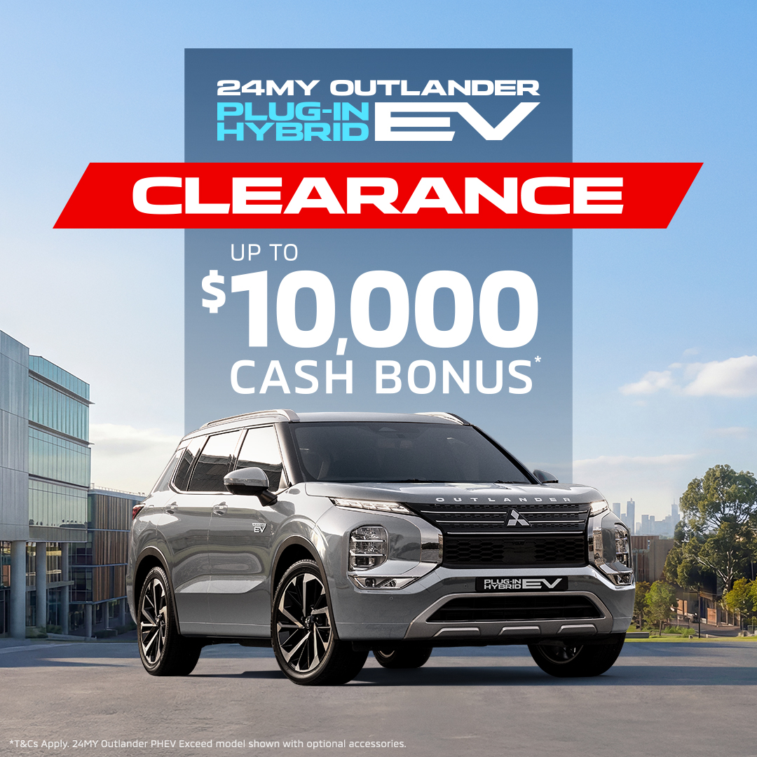The Offer includes: (1) $10,000 Cash Bonus across new 24MY Outlander Plug-in Hybrid EV (PHEV) Exceed, Exceed Tourer and GSR OR (2) $5,000 Cash Bonus across new 24MY Outlander PHEV Aspire OR (3) $3,000 Cash Bonus across new 24MY Outlander PHEV ES. The Cash Bonus is to be redeemed by Customer at point of sale, as a reduction to the final negotiated price. Private and ABN buyers only. The Offer excludes Government, Rental, National Fleet customers as well as purchases utilising an operating lease or similar. Excludes used, novated lease and demo vehicles.