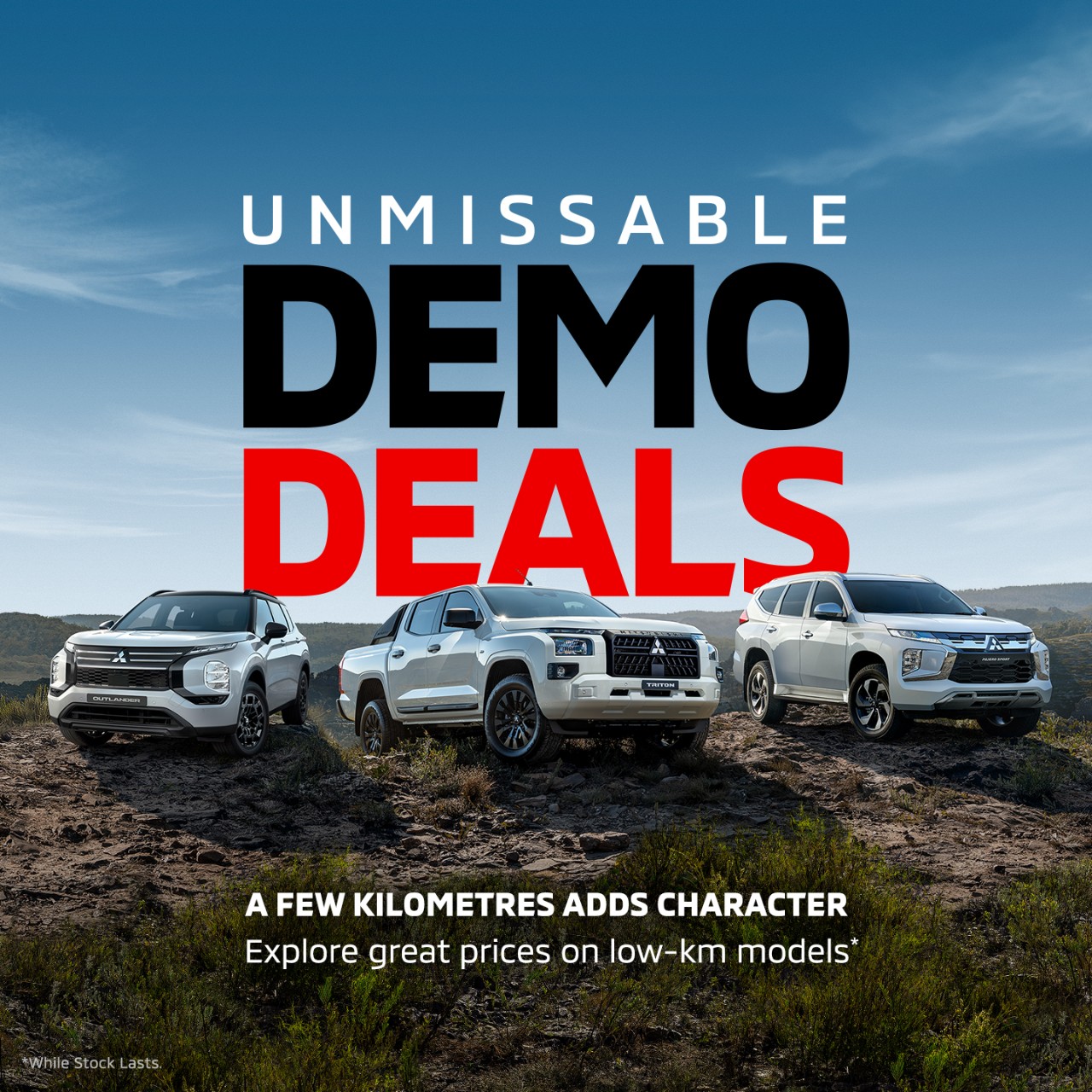 The Demo Deals Sale is on now! Score great prices on low-kilometre Triton, Pajero Sport and Outlander demonstrator models. Speak to your local Dealership today.
