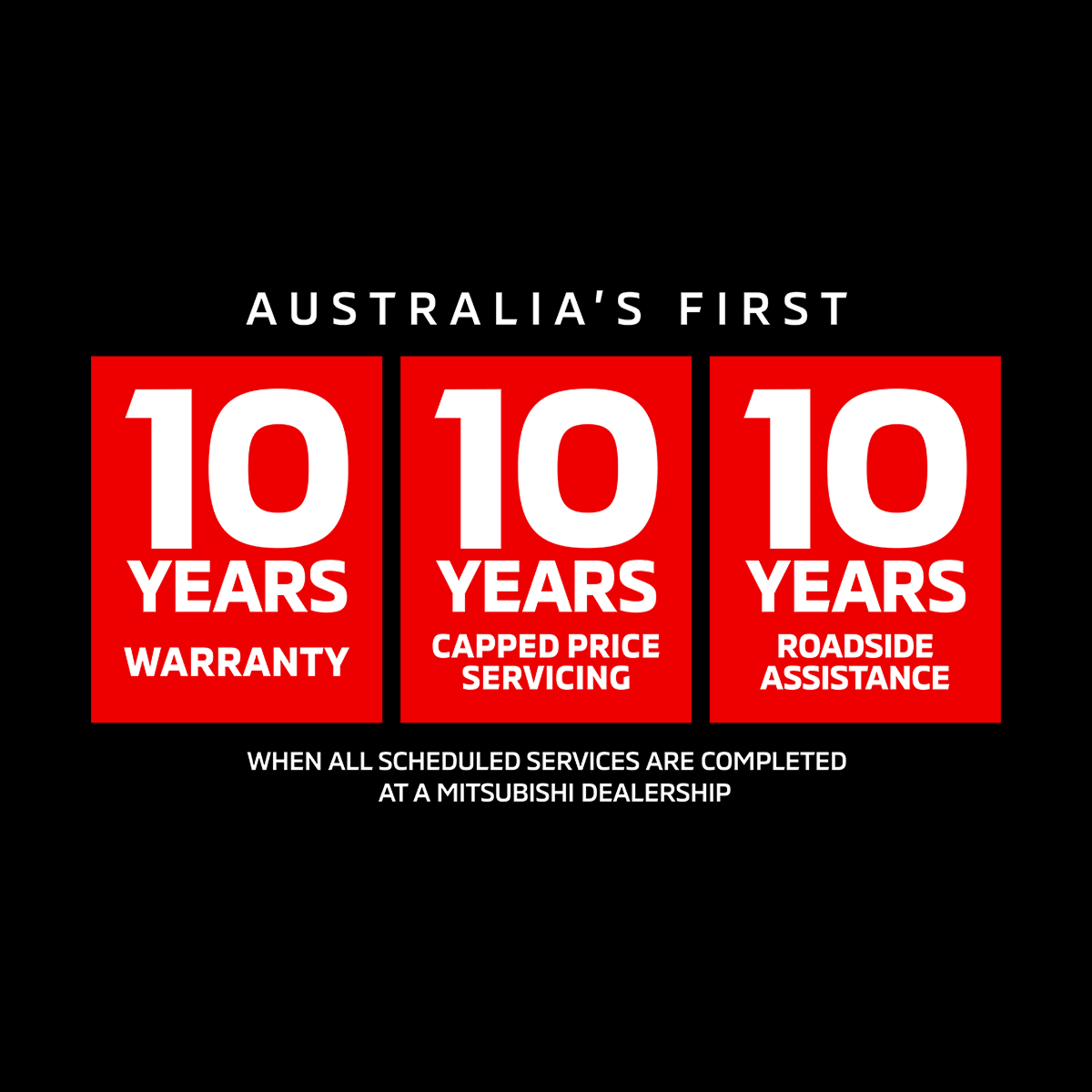 Up to 10 years from the date of first registration or 200,000km (whichever comes first) New Vehicle Warranty when all scheduled services are completed within the specified service intervals at a Mitsubishi Dealership (or if not, 5 years/100,000km warranty applies). 10 year or 150,000km (whichever occurs first) Capped Price Servicing, comprised of the first 10 scheduled services (at 15,000km/12 month scheduled intervals). Any non-scheduled service/repair items are at an additional cost. Up to 10 years Roadside Assistance, comprised of an initial 12-month period extended for further periods of 12 months upon completion of each eligible Capped Price Service (up to a maximum of 10 annual Roadside Assistance periods in total). Eligibility conditions and exclusions apply, full terms and conditions for Diamond Advantage 10 10 10 can be found here: https://www.mitsubishi-motors.com.au/owners/diamond-advantage.html